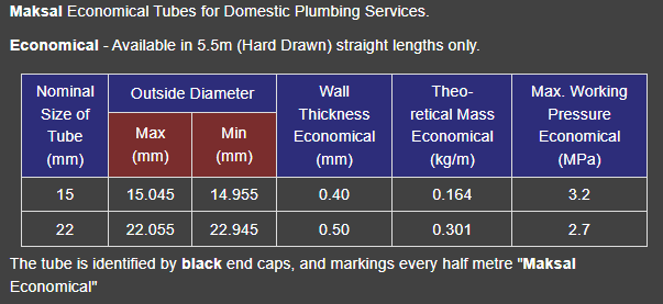 Working Pressures are based on a working stress in the copper tube wall of 72MPa which provides for a factor of safety on the ultimate strength of between 5.24 & 7.1.