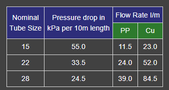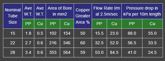 Today there is a tendency to use pipes made from plastic-type materials. These pipes usually have thicker walls than conventional copper tubes, so their internal diameters or bores are considerably smaller. It is after all the bore of the pipe that is important when considering volumes, flow rates and velocities and not the outside diameter of the pipe.