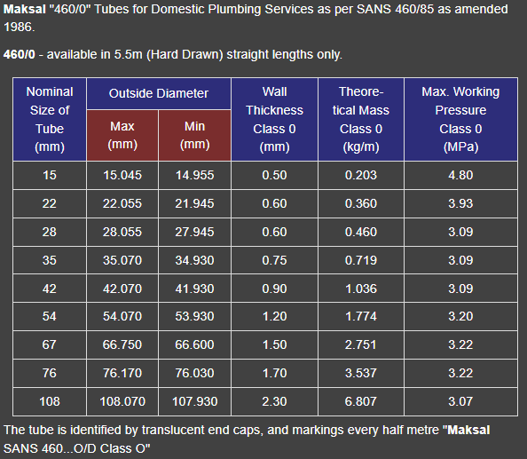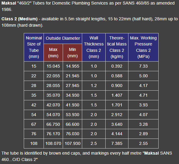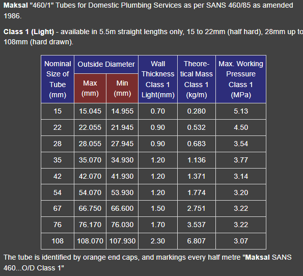 The brazing of capillary fittings to SANS 460 Class 0, copper tube on sizes below 54mm OD and SANS 460 Class 1 copper tube on sizes below 35mm OD, is not recommended by Maksal.