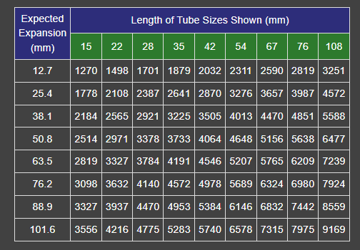 The co-efficient of linear expansion of copper tubing is 0.0166 mm/metre C between O °C and 100°C. Example: For a 60°C rise in temperature between these limits, the linear expansion would be 1mm per metre and between 20°C and 60°C the linear expansion would be 0.67mm per metre.