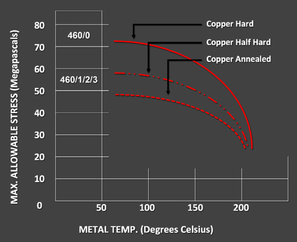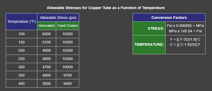 Allowable stresses for annealed and drawn temper copper tube are shown in the table below. They are only a small fraction of copper s ultimate tensile or burst strength. In system design, joint ratings must also be considered, as the lower of the two ratings (tube or joint) will govern the installation. The rated joint strength in soldered tube systems often governs design. However, annealed ratings must be used in brazed systems since the brazing operation may anneal the tube near the joints.