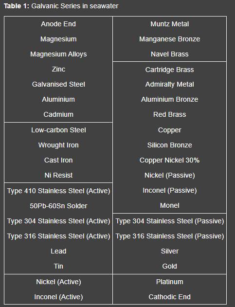 Table 1, lists a galvanic series of metals and alloys valid for dilute solutions such as seawater and weak acids. The metals that are grouped together may be coupled to each other without significant galvanic damage.