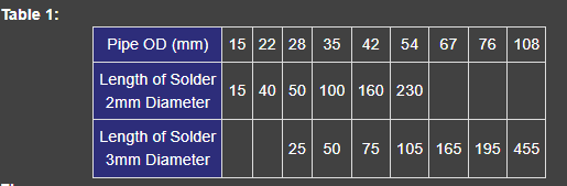 4. The amount of solder used to fill the joint is important if leaks are to be avoided and strength maintained. To assist, refer to Table 1, which shows recommended lengths of solder to be used for the different joint sizes. It is recommended that this table is used and the solder bent at right angles and used as a guide to ensure sufficient solder is applied to each joint whilst also avoiding wastage.